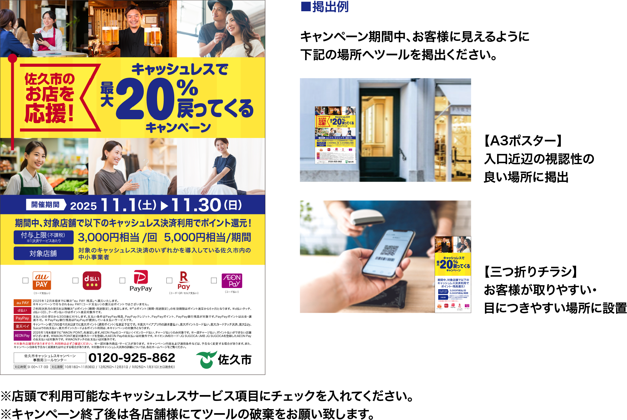 ※詳細は、佐久市キャッシュレスキャンペーン事務局コールセンター(0120-925-862)にお問合せください。